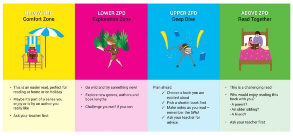 Every term, the children are given a ZPD range. The Zone of Proximal Development is the range of books that will challenge a child without causing frustration or loss of motivation.